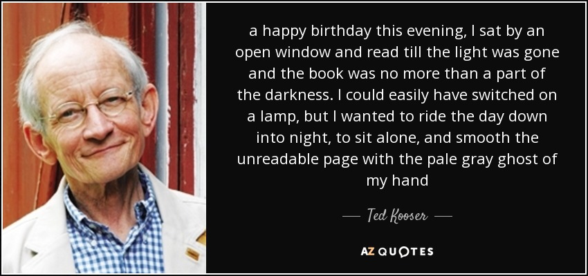 a happy birthday this evening, I sat by an open window and read till the light was gone and the book was no more than a part of the darkness. I could easily have switched on a lamp, but I wanted to ride the day down into night, to sit alone, and smooth the unreadable page with the pale gray ghost of my hand