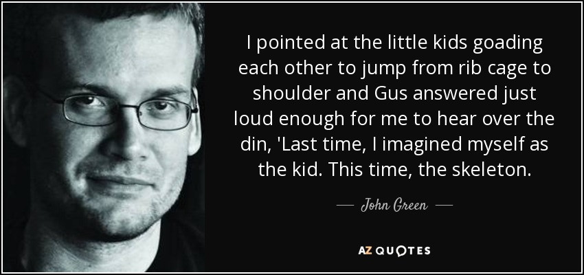 I pointed at the little kids goading each other to jump from rib cage to shoulder and Gus answered just loud enough for me to hear over the din, 'Last time, I imagined myself as the kid. This time, the skeleton.
