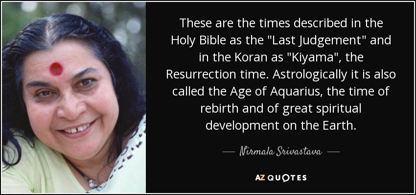 These are the times described in the Holy Bible as the "Last Judgement" and in the Koran as "Kiyama", the Resurrection time. Astrologically it is also called the Age of Aquarius, the time of rebirth and of great spiritual development on the Earth.