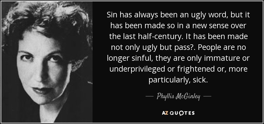 Sin has always been an ugly word, but it has been made so in a new sense over the last half-century. It has been made not only ugly but pass?. People are no longer sinful, they are only immature or underprivileged or frightened or, more particularly, sick.