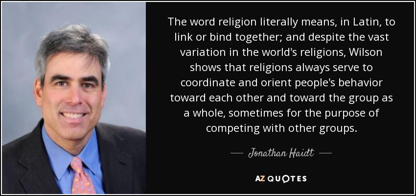 The word religion literally means, in Latin, to link or bind together; and despite the vast variation in the world's religions, Wilson shows that religions always serve to coordinate and orient people's behavior toward each other and toward the group as a whole, sometimes for the purpose of competing with other groups.