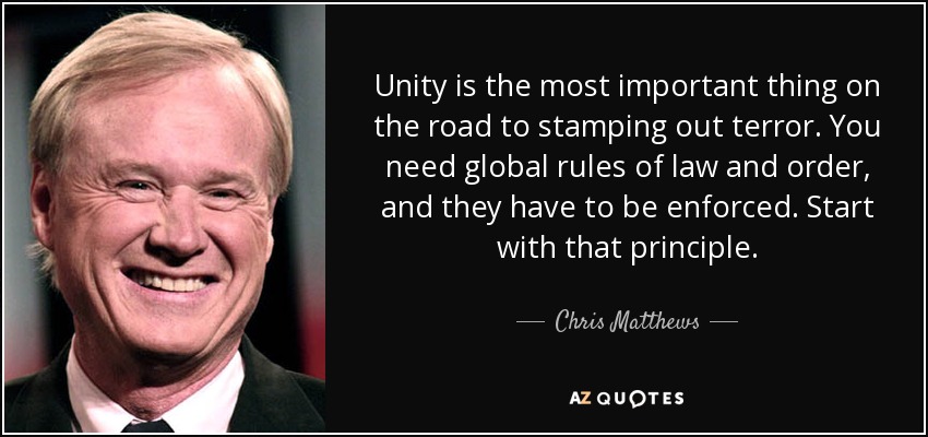 Unity is the most important thing on the road to stamping out terror. You need global rules of law and order, and they have to be enforced. Start with that principle.