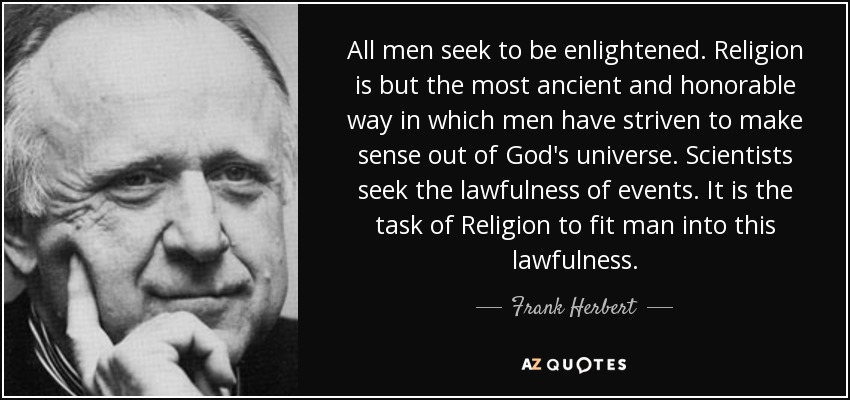 All men seek to be enlightened. Religion is but the most ancient and honorable way in which men have striven to make sense out of God's universe. Scientists seek the lawfulness of events. It is the task of Religion to fit man into this lawfulness.