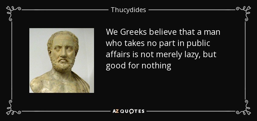 We Greeks believe that a man who takes no part in public affairs is not merely lazy, but good for nothing