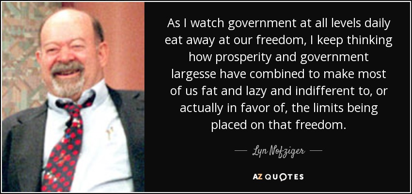 As I watch government at all levels daily eat away at our freedom, I keep thinking how prosperity and government largesse have combined to make most of us fat and lazy and indifferent to, or actually in favor of, the limits being placed on that freedom.