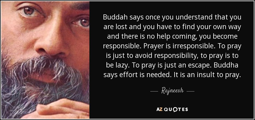 Buddah says once you understand that you are lost and you have to find your own way and there is no help coming, you become responsible. Prayer is irresponsible. To pray is just to avoid responsibility, to pray is to be lazy. To pray is just an escape. Buddha says effort is needed. It is an insult to pray.