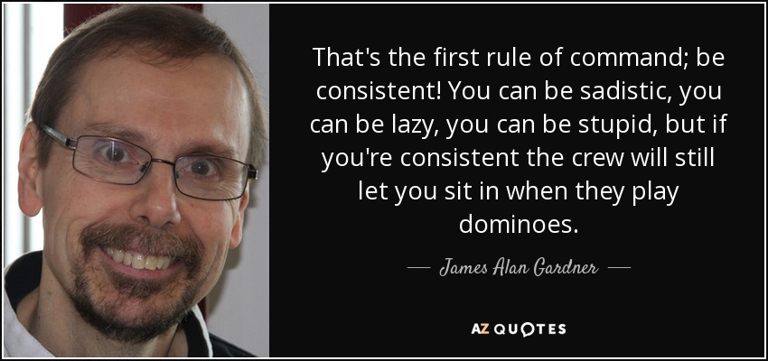 That's the first rule of command; be consistent! You can be sadistic, you can be lazy, you can be stupid, but if you're consistent the crew will still let you sit in when they play dominoes.