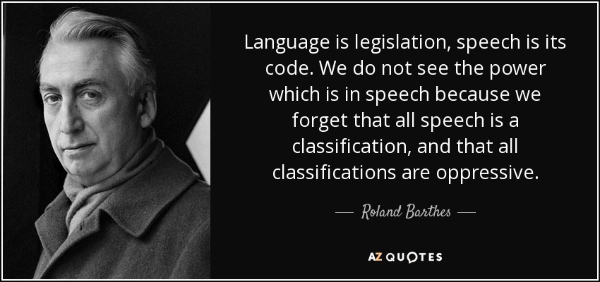 Language is legislation, speech is its code. We do not see the power which is in speech because we forget that all speech is a classification, and that all classifications are oppressive.