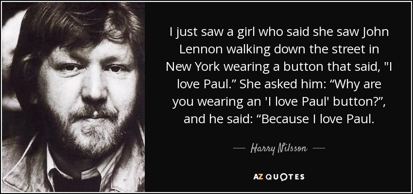 I just saw a girl who said she saw John Lennon walking down the street in New York wearing a button that said, "I love Paul.” She asked him: “Why are you wearing an 'I love Paul' button?”, and he said: “Because I love Paul.