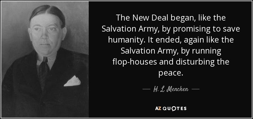 The New Deal began, like the Salvation Army, by promising to save humanity. It ended, again like the Salvation Army, by running flop-houses and disturbing the peace.