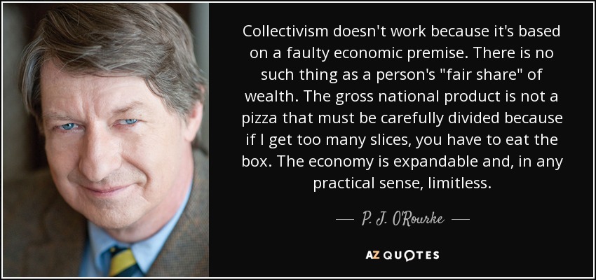 Collectivism doesn't work because it's based on a faulty economic premise. There is no such thing as a person's "fair share" of wealth. The gross national product is not a pizza that must be carefully divided because if I get too many slices, you have to eat the box. The economy is expandable and, in any practical sense, limitless.