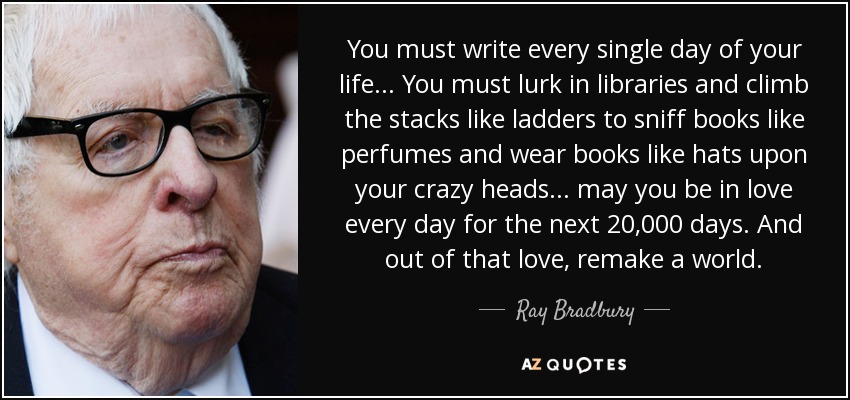You must write every single day of your life... You must lurk in libraries and climb the stacks like ladders to sniff books like perfumes and wear books like hats upon your crazy heads... may you be in love every day for the next 20,000 days. And out of that love, remake a world.