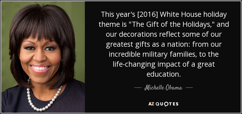 This year's [2016] White House holiday theme is "The Gift of the Holidays," and our decorations reflect some of our greatest gifts as a nation: from our incredible military families, to the life-changing impact of a great education.