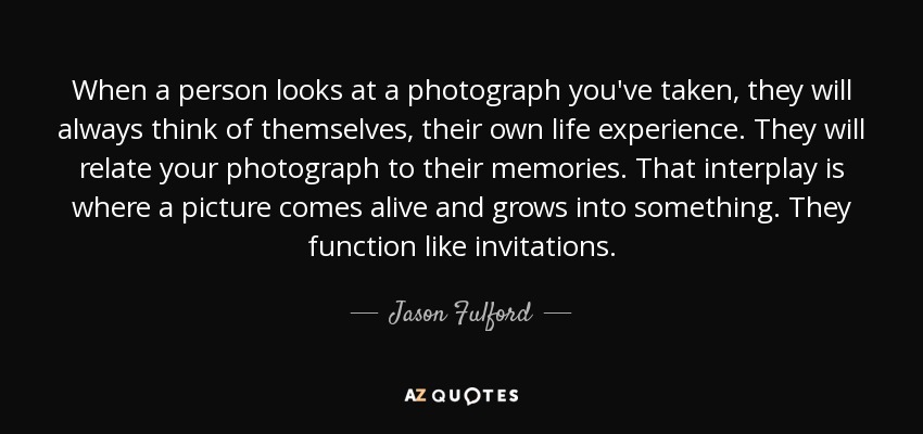 When a person looks at a photograph you've taken, they will always think of themselves, their own life experience. They will relate your photograph to their memories. That interplay is where a picture comes alive and grows into something. They function like invitations.