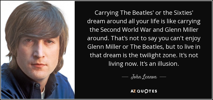 Carrying The Beatles' or the Sixties' dream around all your life is like carrying the Second World War and Glenn Miller around. That's not to say you can't enjoy Glenn Miller or The Beatles, but to live in that dream is the twilight zone. It's not living now. It's an illusion.
