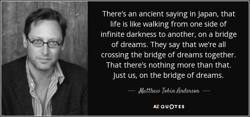 There's an ancient saying in Japan, that life is like walking from one side of infinite darkness to another, on a bridge of dreams. They say that we're all crossing the bridge of dreams together. That there's nothing more than that. Just us, on the bridge of dreams.