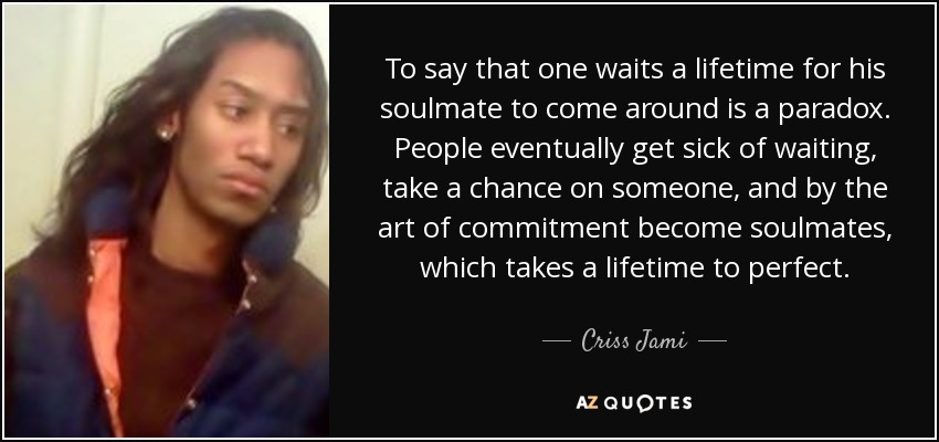 To say that one waits a lifetime for his soulmate to come around is a paradox. People eventually get sick of waiting, take a chance on someone, and by the art of commitment become soulmates, which takes a lifetime to perfect.