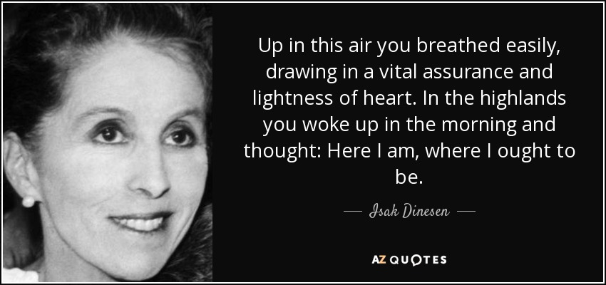 Up in this air you breathed easily, drawing in a vital assurance and lightness of heart. In the highlands you woke up in the morning and thought: Here I am, where I ought to be.