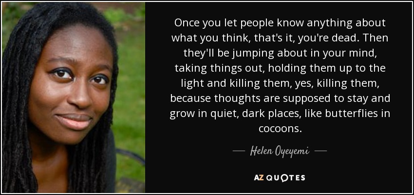 Once you let people know anything about what you think, that's it, you're dead. Then they'll be jumping about in your mind, taking things out, holding them up to the light and killing them, yes, killing them, because thoughts are supposed to stay and grow in quiet, dark places, like butterflies in cocoons.