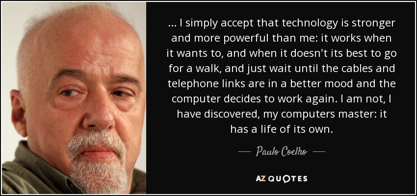 ... I simply accept that technology is stronger and more powerful than me: it works when it wants to, and when it doesn't its best to go for a walk, and just wait until the cables and telephone links are in a better mood and the computer decides to work again. I am not, I have discovered, my computers master: it has a life of its own.