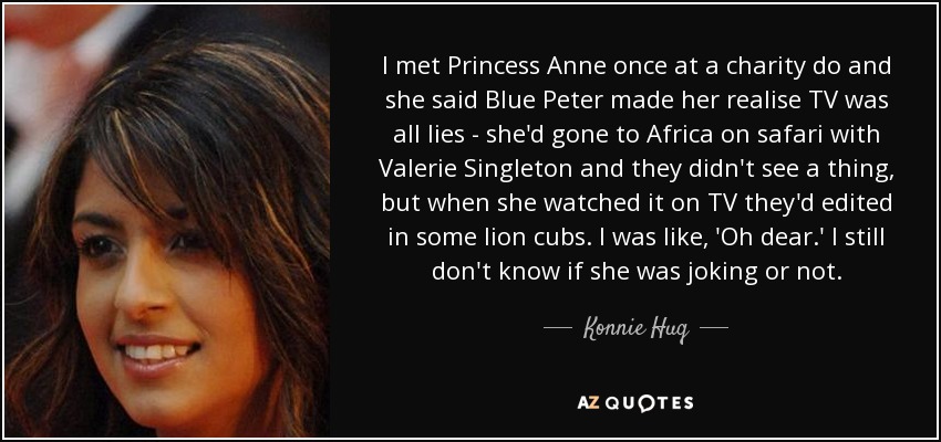 I met Princess Anne once at a charity do and she said Blue Peter made her realise TV was all lies - she'd gone to Africa on safari with Valerie Singleton and they didn't see a thing, but when she watched it on TV they'd edited in some lion cubs. I was like, 'Oh dear.' I still don't know if she was joking or not.