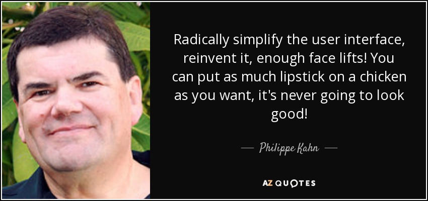 Radically simplify the user interface, reinvent it, enough face lifts! You can put as much lipstick on a chicken as you want, it's never going to look good!