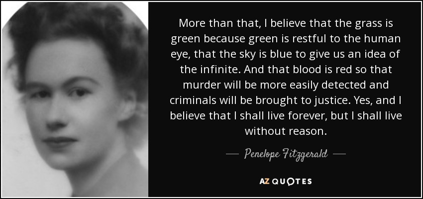 More than that, I believe that the grass is green because green is restful to the human eye, that the sky is blue to give us an idea of the infinite. And that blood is red so that murder will be more easily detected and criminals will be brought to justice. Yes, and I believe that I shall live forever, but I shall live without reason.