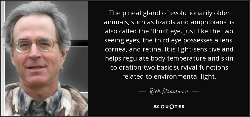 The pineal gland of evolutionarily older animals, such as lizards and amphibians, is also called the 'third' eye. Just like the two seeing eyes, the third eye possesses a lens, cornea, and retina. It is light-sensitive and helps regulate body temperature and skin coloration-two basic survival functions related to environmental light.