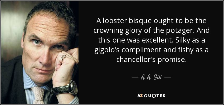 A lobster bisque ought to be the crowning glory of the potager. And this one was excellent. Silky as a gigolo's compliment and fishy as a chancellor's promise.