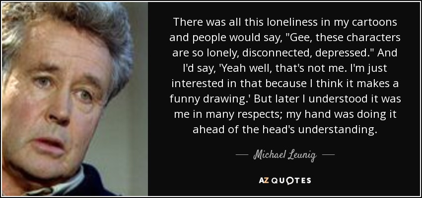 There was all this loneliness in my cartoons and people would say, "Gee, these characters are so lonely, disconnected, depressed." And I'd say, 'Yeah well, that's not me. I'm just interested in that because I think it makes a funny drawing.' But later I understood it was me in many respects; my hand was doing it ahead of the head's understanding.