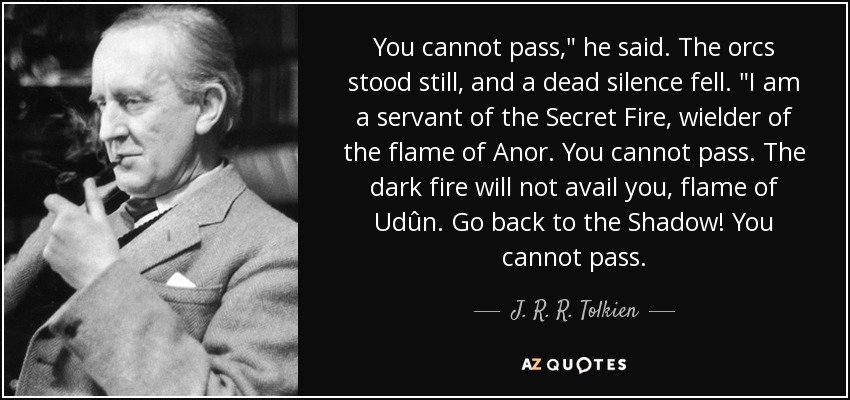 You cannot pass," he said. The orcs stood still, and a dead silence fell. "I am a servant of the Secret Fire, wielder of the flame of Anor. You cannot pass. The dark fire will not avail you, flame of Udûn. Go back to the Shadow! You cannot pass.