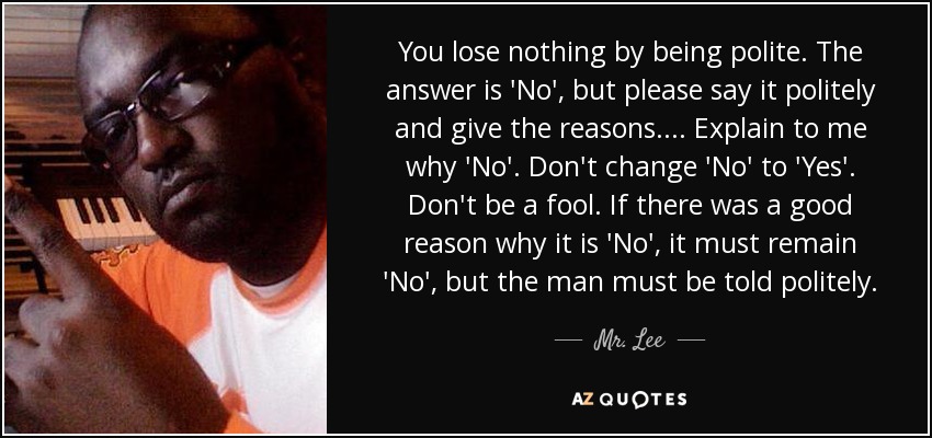 You lose nothing by being polite. The answer is 'No', but please say it politely and give the reasons. ... Explain to me why 'No'. Don't change 'No' to 'Yes'. Don't be a fool. If there was a good reason why it is 'No', it must remain 'No', but the man must be told politely.