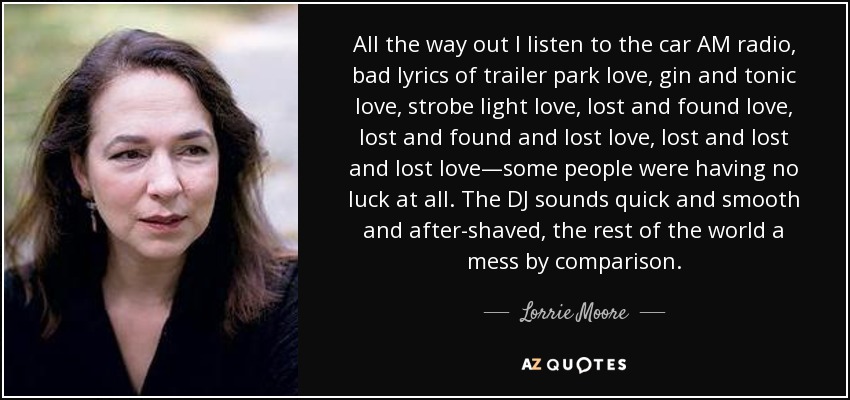 All the way out I listen to the car AM radio, bad lyrics of trailer park love, gin and tonic love, strobe light love, lost and found love, lost and found and lost love, lost and lost and lost love—some people were having no luck at all. The DJ sounds quick and smooth and after-shaved, the rest of the world a mess by comparison.