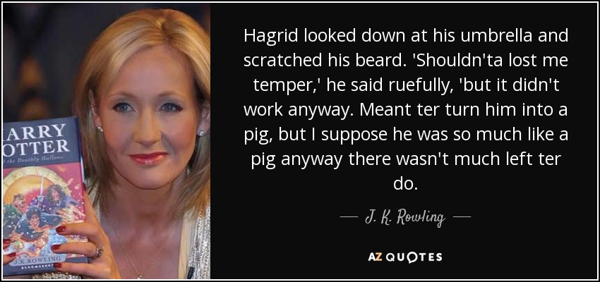 Hagrid looked down at his umbrella and scratched his beard. 'Shouldn'ta lost me temper,' he said ruefully, 'but it didn't work anyway. Meant ter turn him into a pig, but I suppose he was so much like a pig anyway there wasn't much left ter do.