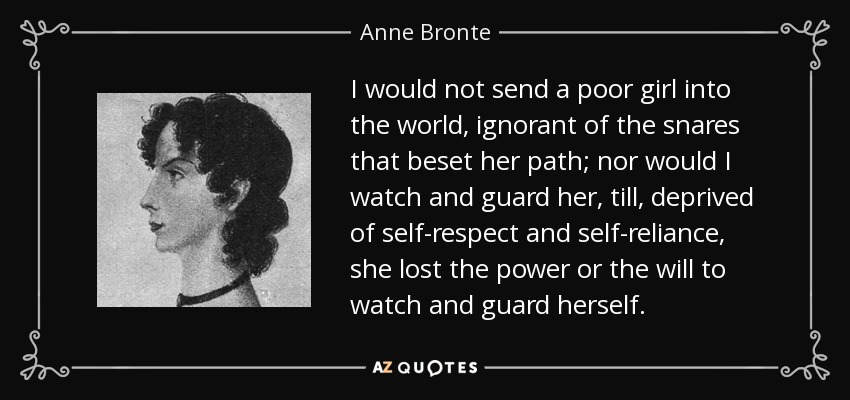 I would not send a poor girl into the world, ignorant of the snares that beset her path; nor would I watch and guard her, till, deprived of self-respect and self-reliance, she lost the power or the will to watch and guard herself .