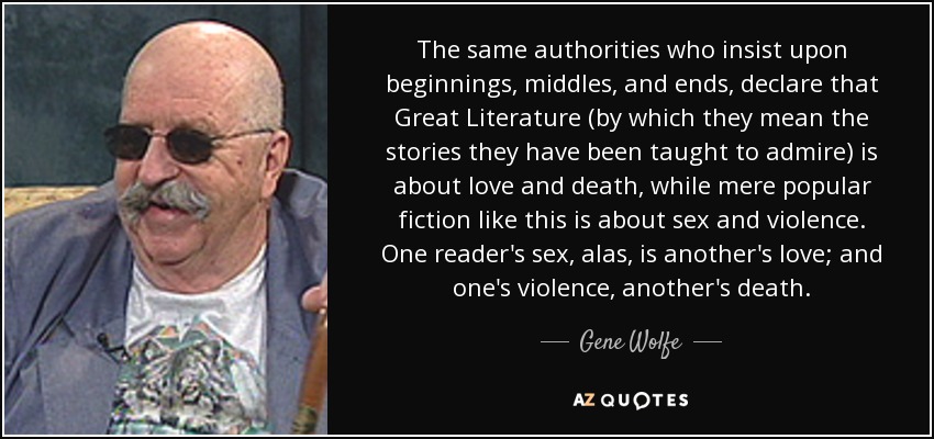 The same authorities who insist upon beginnings, middles, and ends, declare that Great Literature (by which they mean the stories they have been taught to admire) is about love and death, while mere popular fiction like this is about sex and violence. One reader's sex, alas, is another's love; and one's violence, another's death.