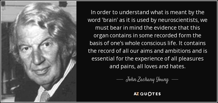 In order to understand what is meant by the word 'brain' as it is used by neuroscientists, we must bear in mind the evidence that this organ contains in some recorded form the basis of one's whole conscious life. It contains the record of all our aims and ambitions and is essential for the experience of all pleasures and pains, all loves and hates.