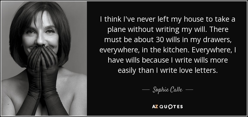 I think I've never left my house to take a plane without writing my will. There must be about 30 wills in my drawers, everywhere, in the kitchen. Everywhere, I have wills because I write wills more easily than I write love letters.