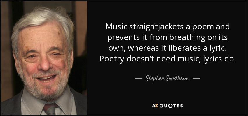 Music straightjackets a poem and prevents it from breathing on its own, whereas it liberates a lyric. Poetry doesn't need music; lyrics do.