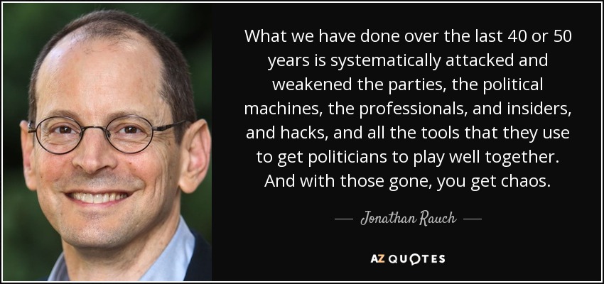 What we have done over the last 40 or 50 years is systematically attacked and weakened the parties, the political machines, the professionals, and insiders, and hacks, and all the tools that they use to get politicians to play well together. And with those gone, you get chaos.