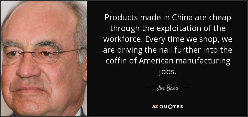 Products made in China are cheap through the exploitation of the workforce. Every time we shop, we are driving the nail further into the coffin of American manufacturing jobs.