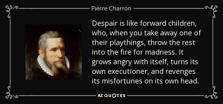 Despair is like forward children, who, when you take away one of their playthings, throw the rest into the fire for madness. It grows angry with itself, turns its own executioner, and revenges its misfortunes on its own head.