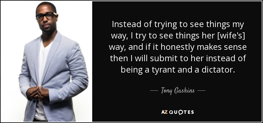Instead of trying to see things my way, I try to see things her [wife's] way, and if it honestly makes sense then I will submit to her instead of being a tyrant and a dictator.