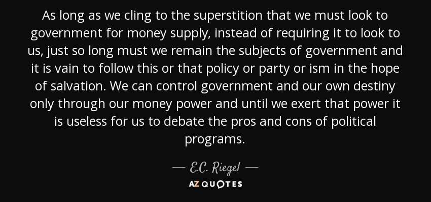 As long as we cling to the superstition that we must look to government for money supply, instead of requiring it to look to us, just so long must we remain the subjects of government and it is vain to follow this or that policy or party or ism in the hope of salvation. We can control government and our own destiny only through our money power and until we exert that power it is useless for us to debate the pros and cons of political programs.