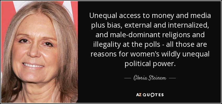Unequal access to money and media plus bias, external and internalized, and male-dominant religions and illegality at the polls - all those are reasons for women's wildly unequal political power.