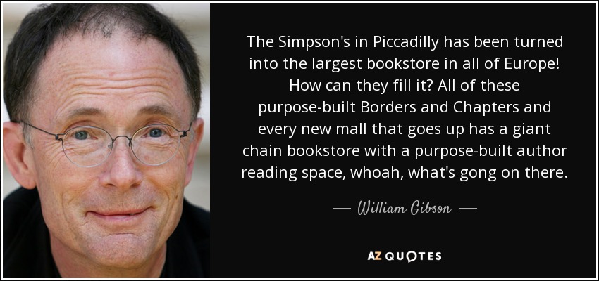 The Simpson's in Piccadilly has been turned into the largest bookstore in all of Europe! How can they fill it? All of these purpose-built Borders and Chapters and every new mall that goes up has a giant chain bookstore with a purpose-built author reading space, whoah, what's gong on there.