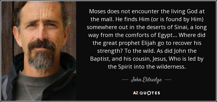 Moses does not encounter the living God at the mall. He finds Him (or is found by Him) somewhere out in the deserts of Sinai, a long way from the comforts of Egypt... Where did the great prophet Elijah go to recover his strength? To the wild. As did John the Baptist, and his cousin, Jesus, Who is led by the Spirit into the wilderness.