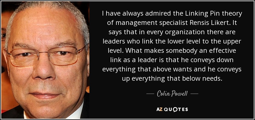I have always admired the Linking Pin theory of management specialist Rensis Likert. It says that in every organization there are leaders who link the lower level to the upper level. What makes somebody an effective link as a leader is that he conveys down everything that above wants and he conveys up everything that below needs.