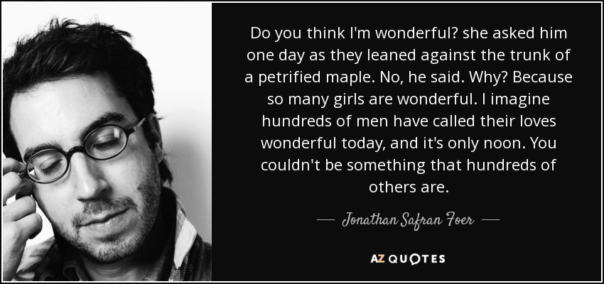 Do you think I'm wonderful? she asked him one day as they leaned against the trunk of a petrified maple. No, he said. Why? Because so many girls are wonderful. I imagine hundreds of men have called their loves wonderful today, and it's only noon. You couldn't be something that hundreds of others are.