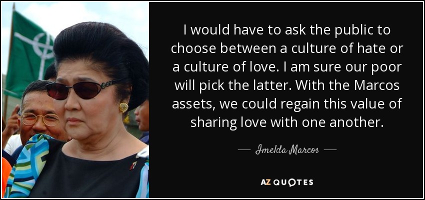 I would have to ask the public to choose between a culture of hate or a culture of love. I am sure our poor will pick the latter. With the Marcos assets, we could regain this value of sharing love with one another.